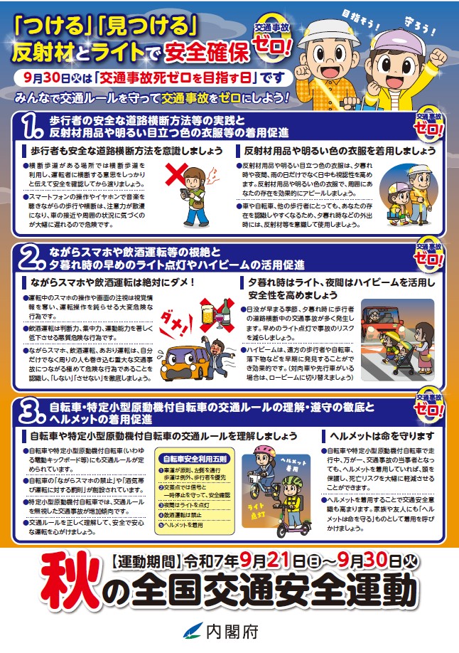 秋の全国交通安全運動は、広く国⺠に交通安全思想の普及・浸透を図り、交通ルールの遵守と正しい交通マナーの実践を習慣付けるとともに、国⺠自身による道路交通環境の改善に向けた取組を推進することにより、交通事故防止の徹底を図ることを目的としています。また、本運動期間中の9月30日は、「交通事故死ゼロを目指す日」です。皆さん一人ひとりが交通安全について考え、交通ルールを守り、交通事故のない社会を目指して取り組んでいきましょう。