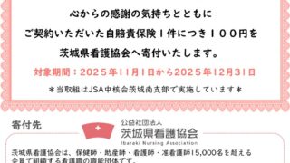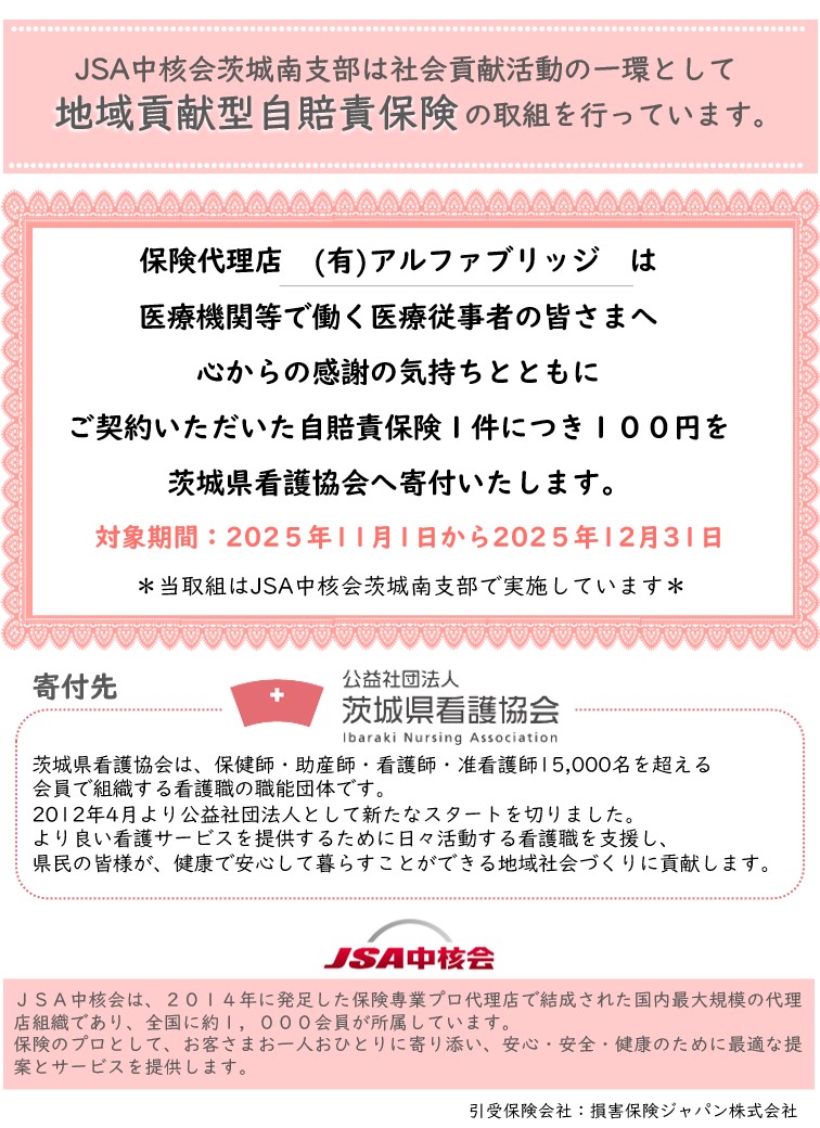 2025年10月29日 / 最終更新日 : 2025年10月29日 alphabridge お知らせ 当社は医療機関等で働く医療従事者の皆さまへ、心からの感謝の気持ちとともに、ご契約いただいた自賠責保険1件につき100円を茨城県看護協会へ寄付いたします。 投稿者プロフィール alphabridge 最新の投稿 お知らせ2025年10月29日当社は医療機関等で働く医療従事者の皆さまへ、心からの感謝の気持ちとともに、ご契約いただいた自賠責保険1件につき100円を茨城県看護協会へ寄付いたします。 お知らせ2025年8月31日9月21日(日)~30日(火)までの10日間、「秋の全国交通安全運動2025」が実施されます。 お知らせ2025年8月15日2025年度『損保ジャパンプロフェッショナルエージェント ハイグレード(PA)認定代理店』に認定されました お知らせ2025年8月12日「SOMPOで乗~る」敢闘賞を受賞いたしました